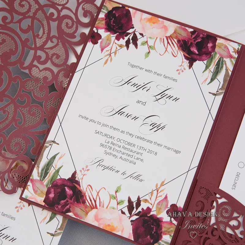 341 elegant champagne watercolor floral wedding invitation.. Elegant rustic laser cut wedding invitation set with twines and key ewws220 as low as 229 burgundy laser cut pocket fold and burgundy floral wedding invitations with glittery belly band ewws267 as low as 319 classic ivory laser cut wedding invitation with foil printing ewws274 as low as 360 fabulous navy blue laser cut wedding invitations with glitter belly band and tag ewws198 as low as. Choose from thousands of customizable wedding invitation templates or create your own from scratch. Choose from hundreds of beautiful burgundy wedding invitation templates in every theme for you to personalise and make your own.