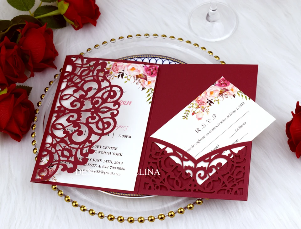 50pcs Elegant Burgundy Spring Flower Laser Cut Wedding Invitations